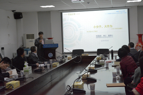 接着,会议邀请湖南湘源美东医药科技有限公司董事长刘晓忠博士进行“小分子,大作为”的学术讲座。刘博士对小分子靶向药物创制的机遇与风险进行剖析,预测小分子靶向药物研究在国内会出现井喷现象,并分享了初创阶段药物研发策略和思路。刘博士还详细解答了老师和同学的提问。