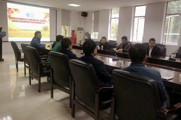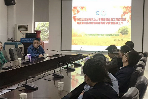 在此之后,兽用蛋白质工程疫苗重点实验室副主任王乃东教授介绍了来访专家,和兽用蛋白质工程疫苗实验室成员组成、研究方向与日常工作。随后列举实验室的成果与合作情况,并讲述了实验室的突出优点与所存在的问题。湖南农业大学动物医学院裴虎副院长还重点介绍了该校动物医学院的历史与未来发展。