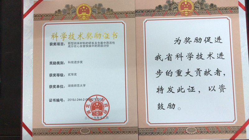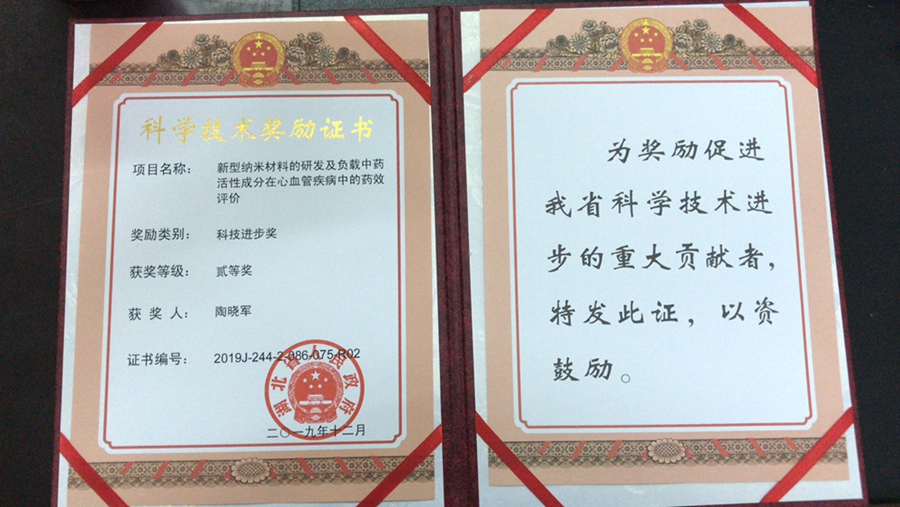 小分子靶向药物发现与创制湖南省重点实验室包含四个研究方向,其中,纳米靶向制剂研究方向主要是聚焦纳米药物及纳米制剂在重大疾病上的靶向性及定位释放功能。2019年12月,纳米靶向制剂研究方向陶晓军副教授课题组与湖北医药学院张秋芳教授合作项目《新型纳米材料的研发及负载中药活性成分在心血管疾病中的药效评价》获得湖北省科技进步奖二等奖。