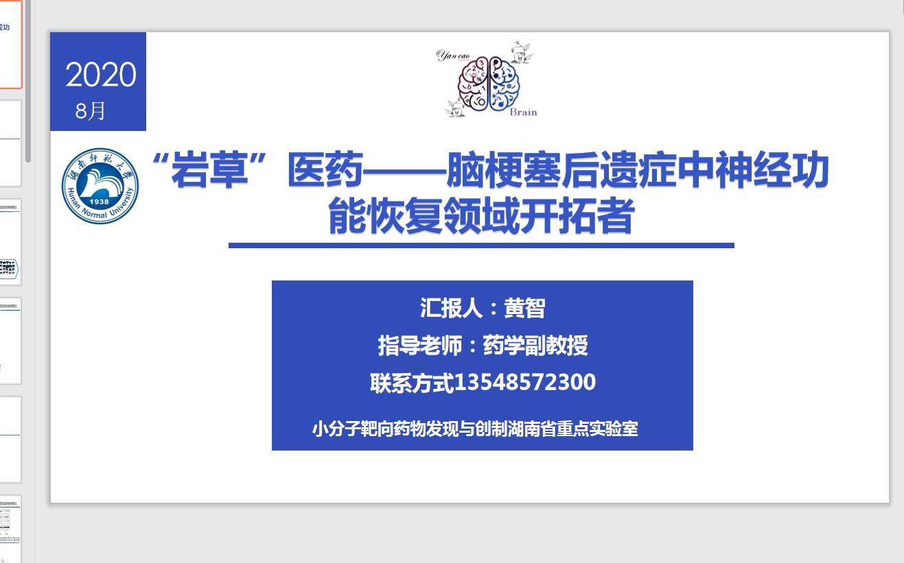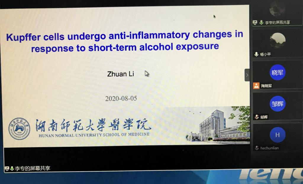 8月5日晚上8点,重点实验室通过腾讯会议召开第三次工作和学术交流会,李专教授作了题目《Kupffer cells undergo anti-inflammatory changes in response to short-term alcohol exposure》的报告。邹辉副教授作了题目《卷柏新颖天然产物的发现及其生物学功能研究》,就报告的内容,进行了深入的讨论,重点实验室成员对各自的研究有了进一步深入的了解。本次会议由杨小平主任主持,会后,重点实验室主要成员对陶晓军副教授指导的第九届“挑战杯”湖南省大学生创业大赛项目《岩草”医药——脑梗塞后遗症中神经功能恢复领域开拓者》进行了点评并提出了修改意见,会议还讨论了重点实验室其他方面事务。