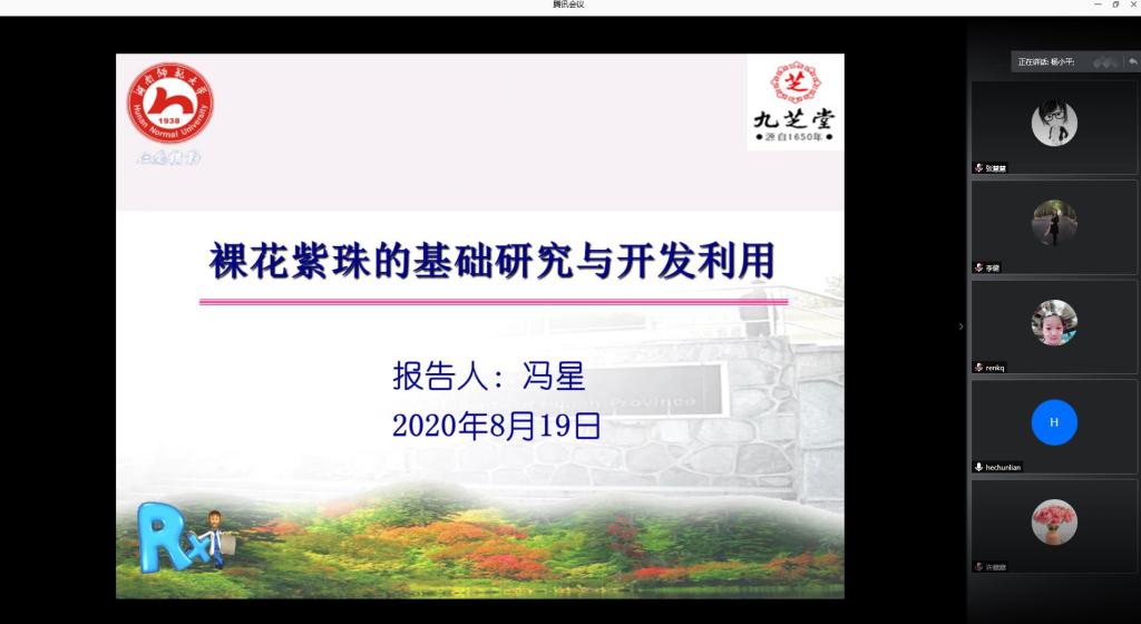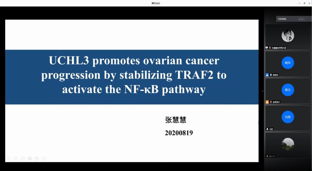 8月19日8点,重点实验室通过腾讯会议继续召开第四次交流会,冯星教授作了题为《祼花紫珠的基础研究与开发利用》的报告。张慧慧博士作了《UCHL3 promotes ovarian cancer progression by stabilizing TRAF2 to activate the NF-κB pathway》。参会人员就报告的内容,进行了深入的讨论,会议进一步明确了重点实验室内部合作和外部交流合作的必要性。本次会议由杨小平主任主持,会议还讨论了重点实验室将来工作的重点和方向。
