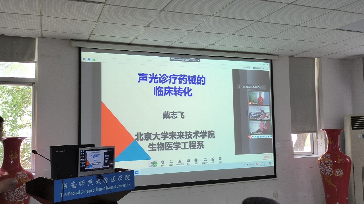 会议第二项内容,北京大学未来技术学院生物医学工程系戴志飞教授做了题为《声光诊疗药械的临床转化》的报告。戴志飞教授分享了其课题组研发的新型超声造影剂、纳米增效的超声智能诊疗仪以及近红外荧光探针PKU-800三个工作,根据自己的切身经历,与在座的教师和研究生分享了成果转化以及开展临床试验方面的经验。杨小平教授、李专教授、冯星教授以及重点实验室的其他老师和研究生们围绕成果转化和临床实验的开展和戴教授进行了学术探讨。